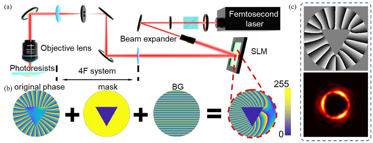 圖3(a)空間光調制器輔助的飛秒激光雙光子加工系統;(b)空間光調制上的加載相位;(c)離散渦旋光束全息圖及聚焦光斑