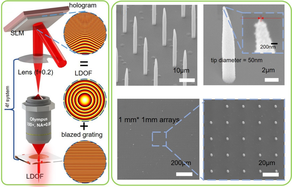 中國科學技術大學微納米工程實驗室激光加工團隊將基于SLM的全息光場調控技術與飛秒激光加工技術相結合,利用液晶空間光調制器將高斯分布的飛秒激光調制成多焦點陣列、貝塞爾光、渦旋光和艾里光等結構光場,用于多功能微納米器件的高效加工。該技術方案能夠在保留飛秒激光高分辨率、真三維加工能力的基礎上極大地提高飛秒激光的加工效率。